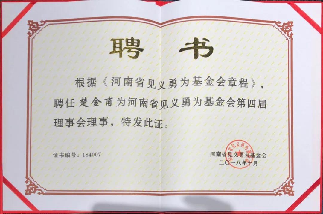 根据《河南省见义勇为基金章程》聘任楚金甫为河南省见义勇为基金会第四届理事会。