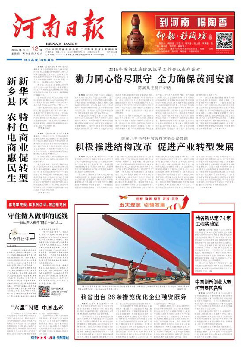 河南日报头版报道——我省新认定河南安博(中国)电气股份有限公司智能互联输配电装备及系统集成等74家省工程实验室