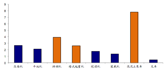 2015年工程机械的设备的租赁利用率相对排名与2012年类似,在主要的工程机械品种中,利用率排名靠前的为使用频率较低并且月租金相对较高的混泥土泵车和塔式起重机。不过需要特别指出的是,2015年工程机械租赁整体利用率下滑明显,之前租赁利用率较高的品种如塔式起重机2015年的利用率估计只有50%-55%,挖掘机的租赁利用率甚至下降到不足30%。我们认为,在现行的经济环境下,行业依然可以通过提高租赁服务的水平来提高利用率。